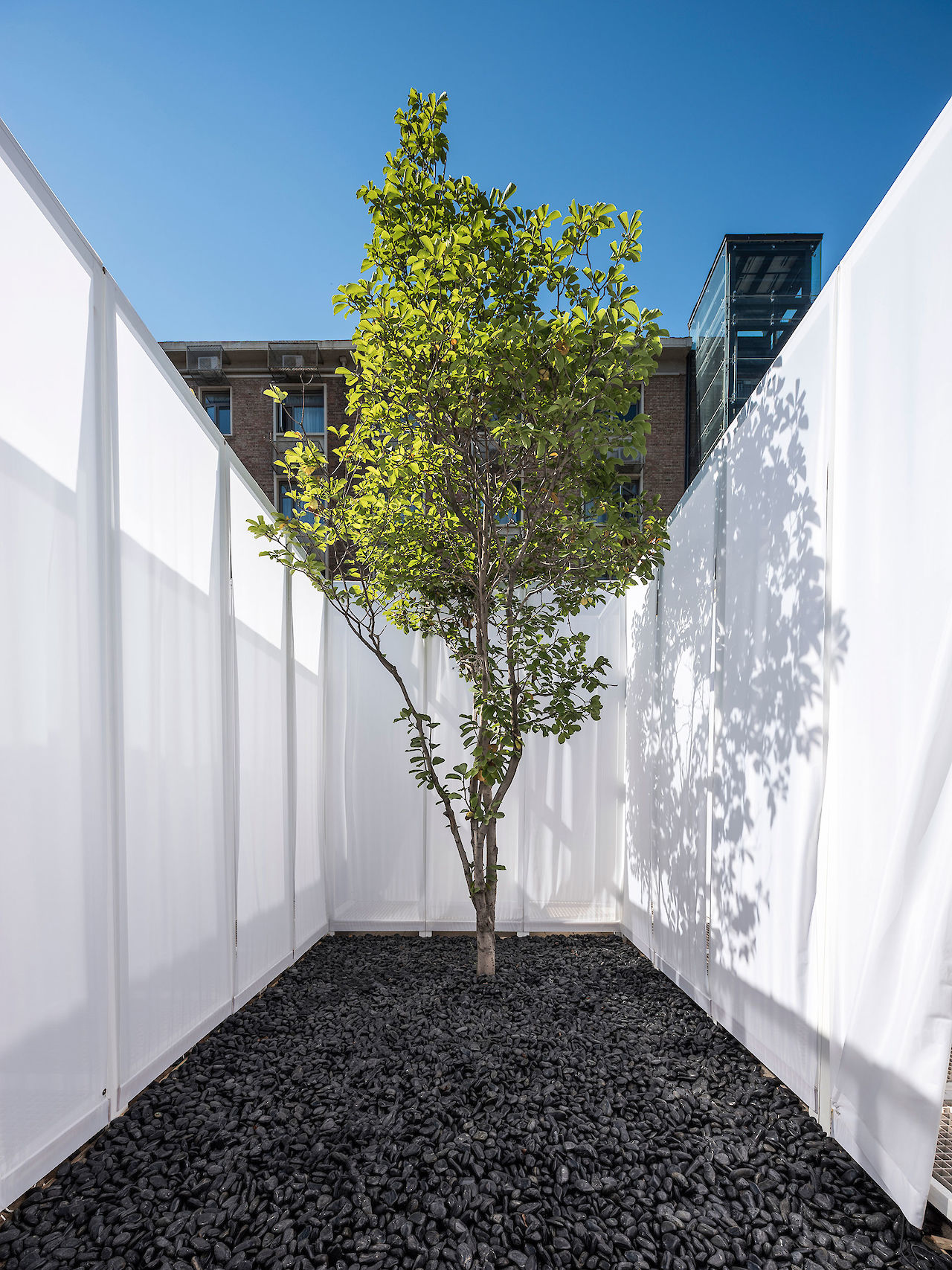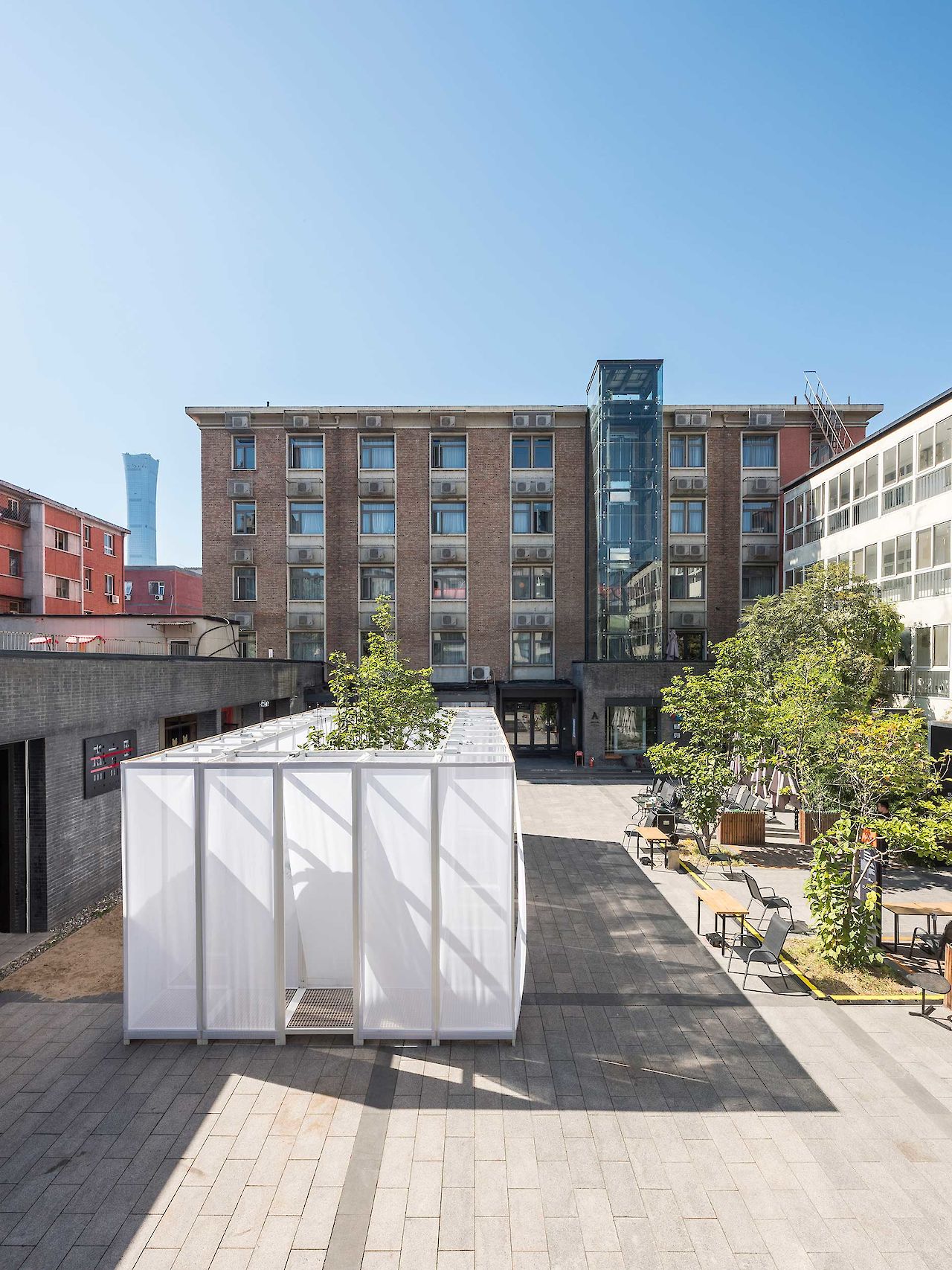 Superimpose set the goal to convert the Yan Jing Lane – which is basically a parking lot – to a comfortable and friendly place to stay. To provide a more human-scale to the courtyard, Superimpose place the pavilion to become a smaller courtyard in the larger courtyard. The rectangular pavilion framed two neglected trees in the parking lot and made them the centerpiece.