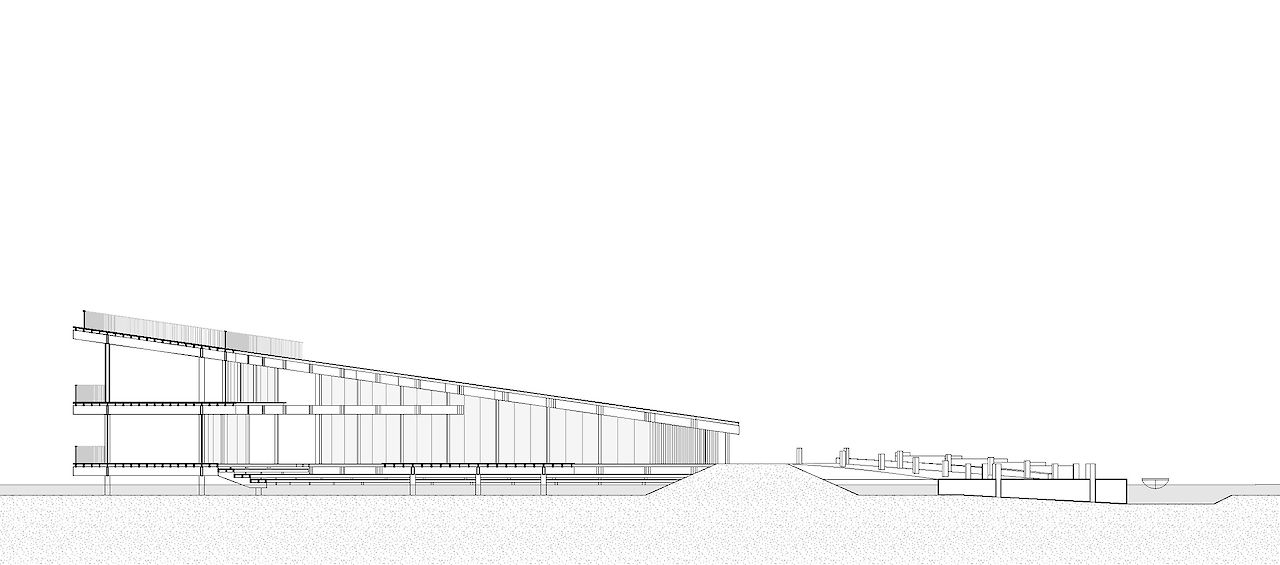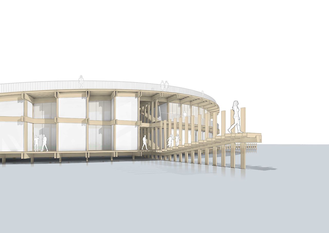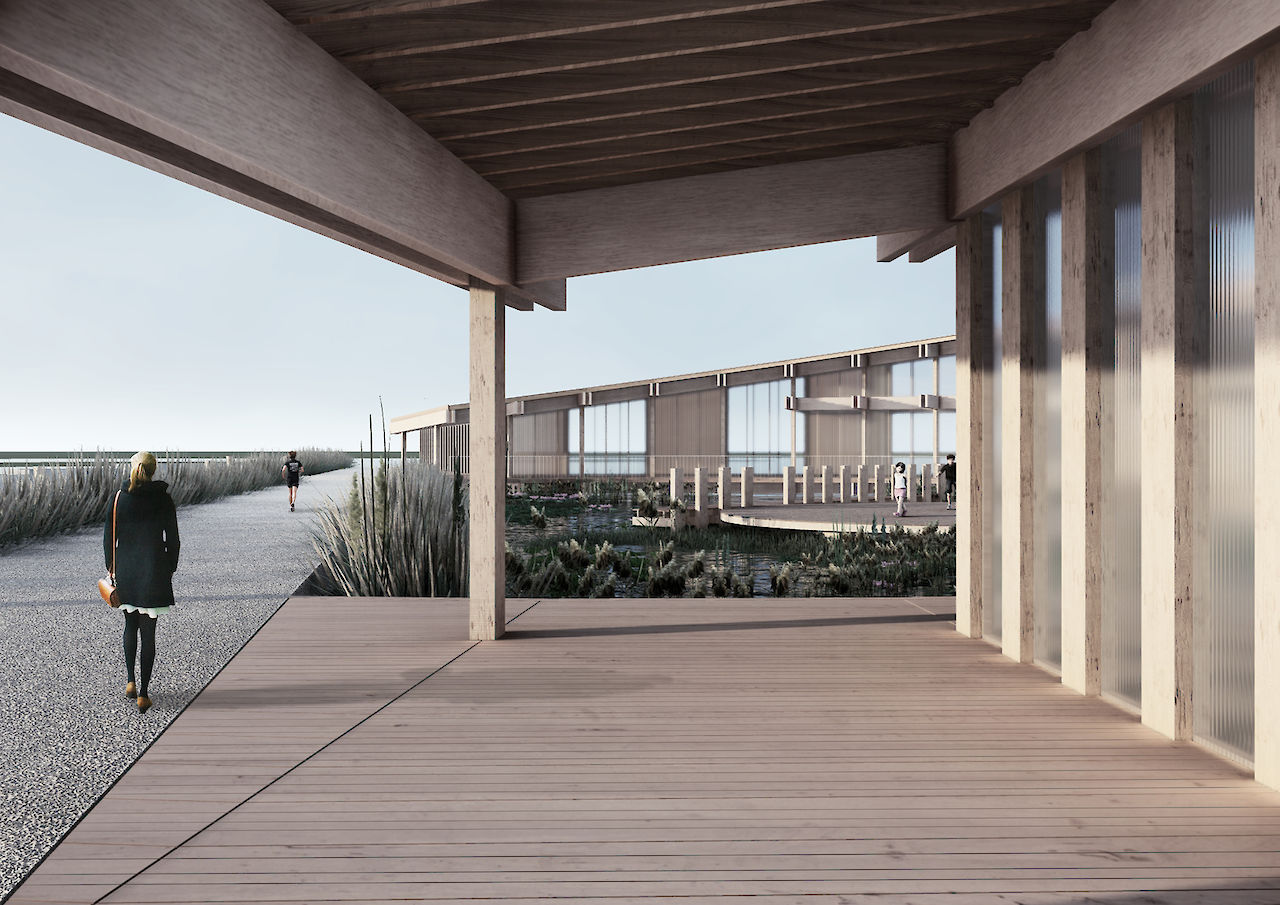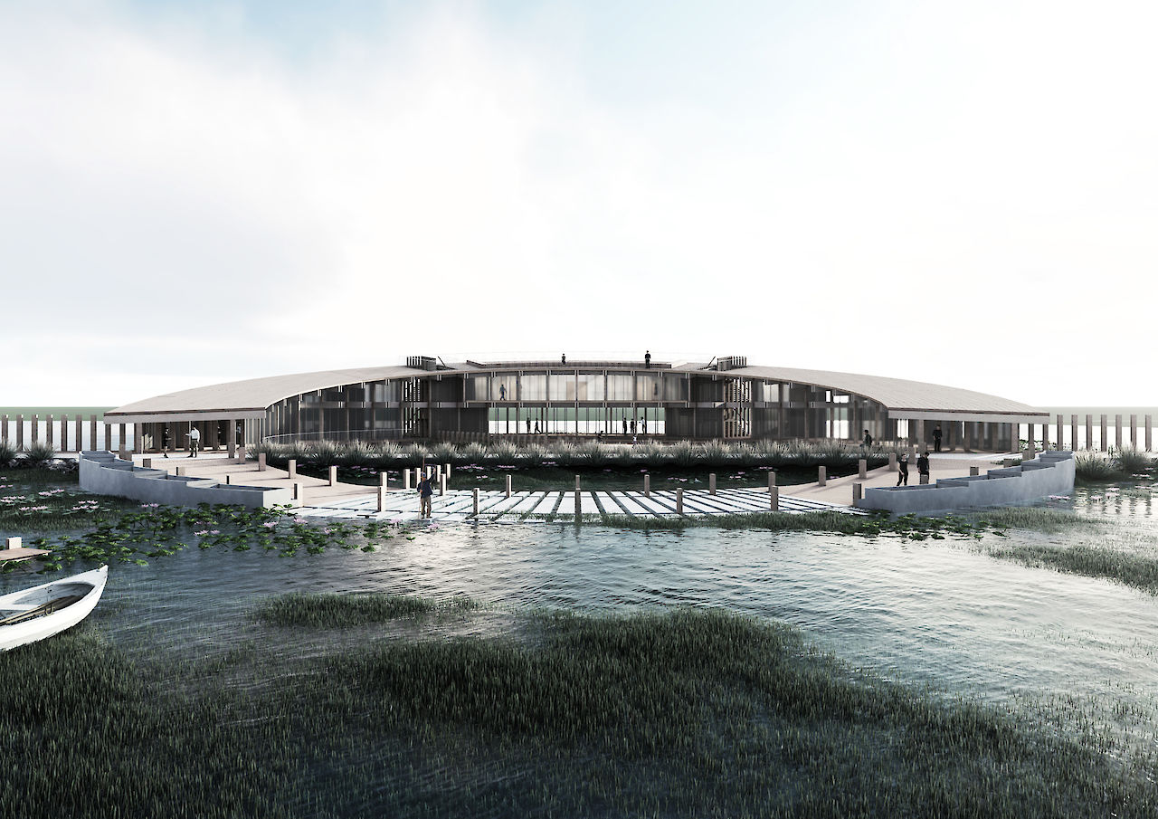 Superimpose visited the site and decided to design the new experience and education center as close as possible to the farming location, and even intended to be part of it. The circular ring shape is superimposed on an existing dyke situated between two different types of crayfish ponds. With its remarkable but prominent location the project becomes a literal bridge between farmer and visitor and promote interactions between visitors and farmers. The dyke also provides access to the pavilion.