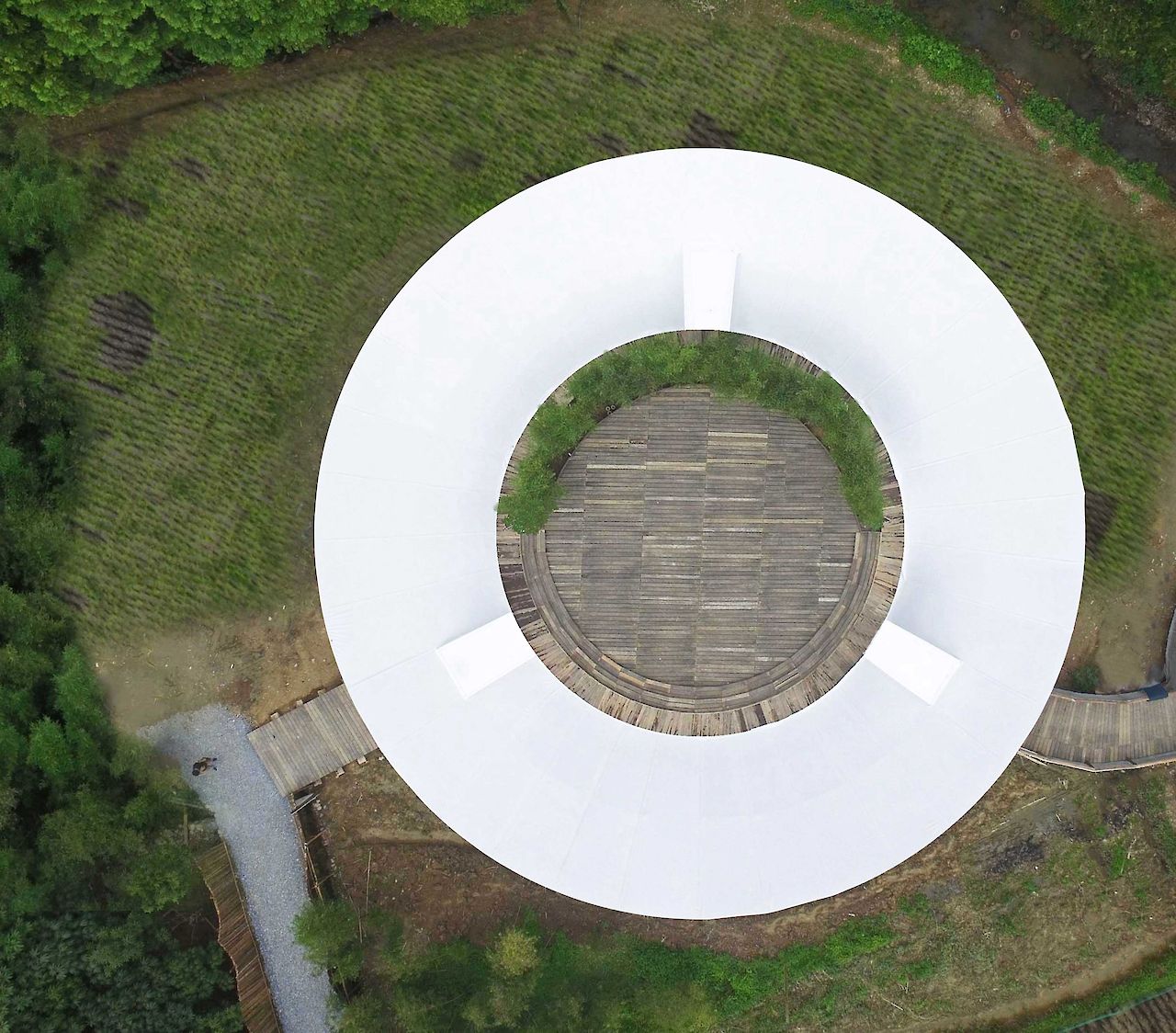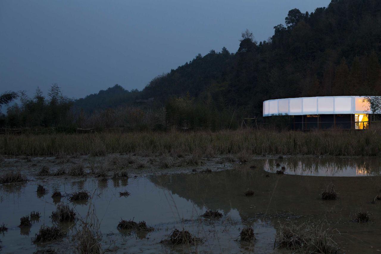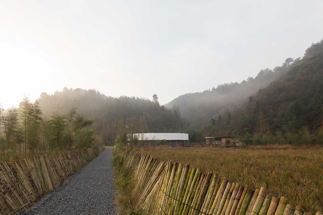 In between bamboo paddies and rice fields in the rural Tai Yang Valley, West of Hangzhou, ‘Micr-O’ is initiated to provide an education platform and camping accommodation to support sustainable farming and healthy living and respond to the increasing urbanization in China. The pavilion provides a large central patio for activities and events, surrounded by a white camping tent.