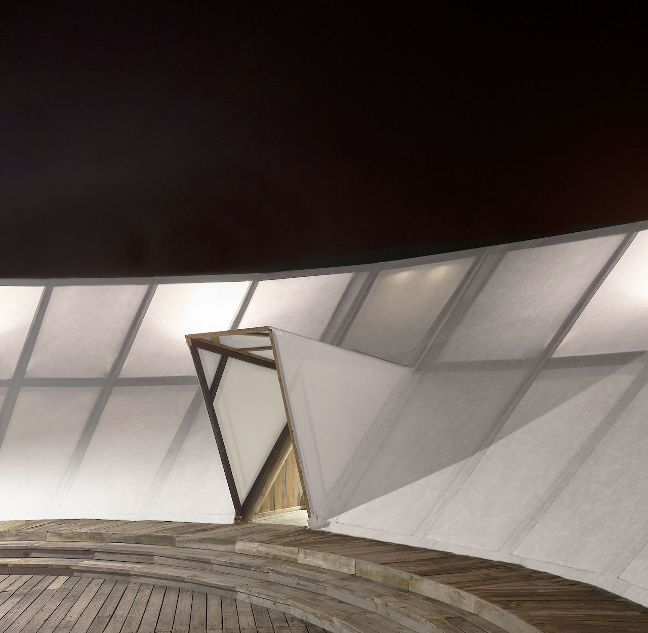 The construction is a good example of time-and-cost-effective design. Superimpose used locally reclaimed pinewood for the structure and for the wooden decking and a re-useable tent canvas cover, making the project fully circular. The simplicity of repetitive structural ‘A’ frame creates a bold gesture in the valley.