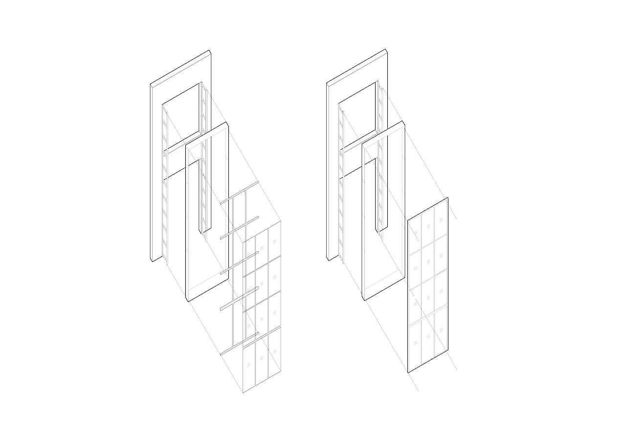 The repetitive nature of the South façade is emphasized by the replacement of protruded black aluminum frames and clear double glazed windows, with operable pivot doors for outdoor events.
