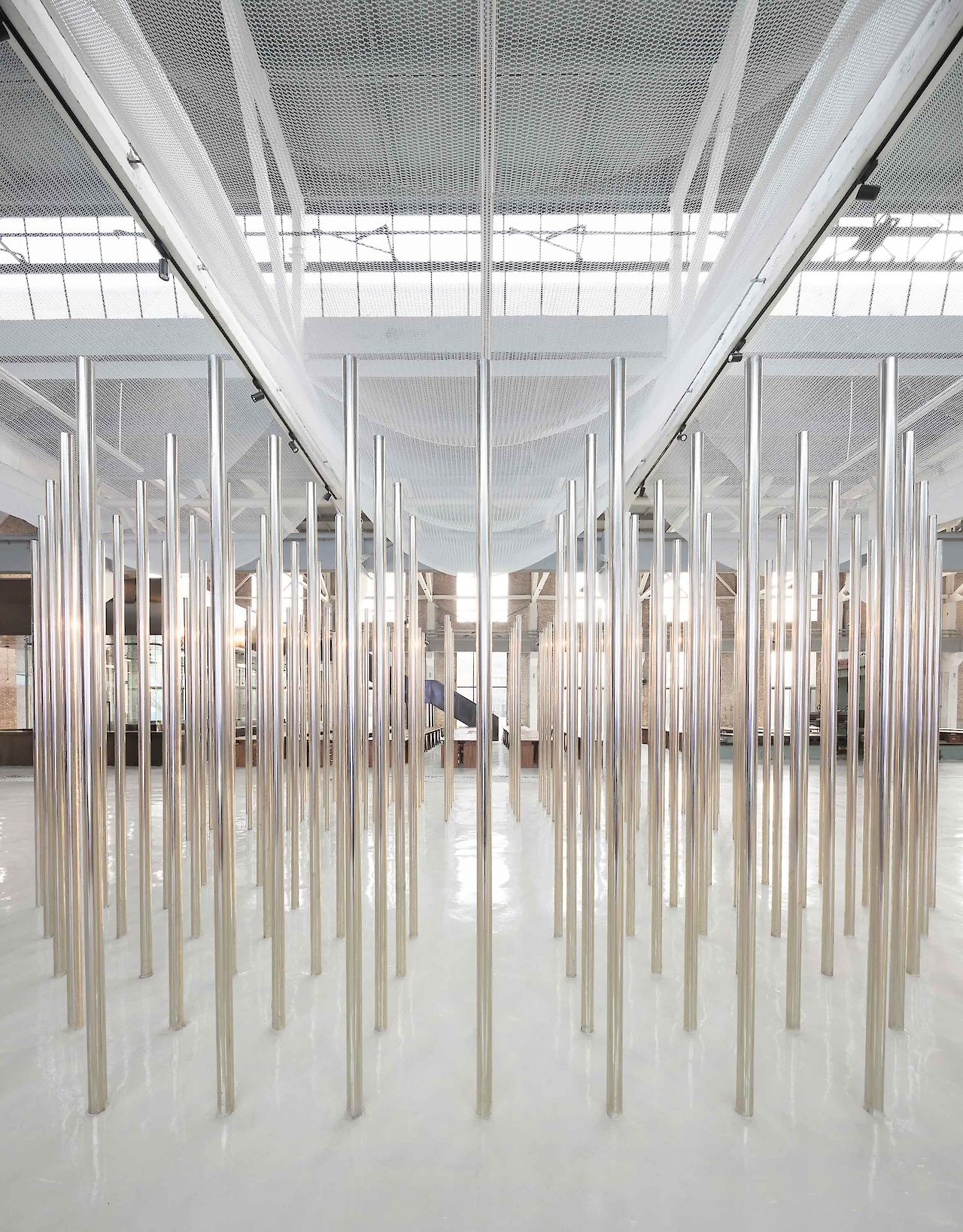 Coinciding with the central catwalk, a white ‘veil’ metal mesh is hung from the ceiling. The ‘veil’ is hung in between the repetitive beams and columns, articulating the rhythmic structure of the architecture. The application of the ‘veil’ helps softening the industrial space. It filters the daylight from the roof light and defines a human scale within the vast space. Light fixtures are placed in between and above the mesh, creating multiple light configurations for different occasions during the evening.