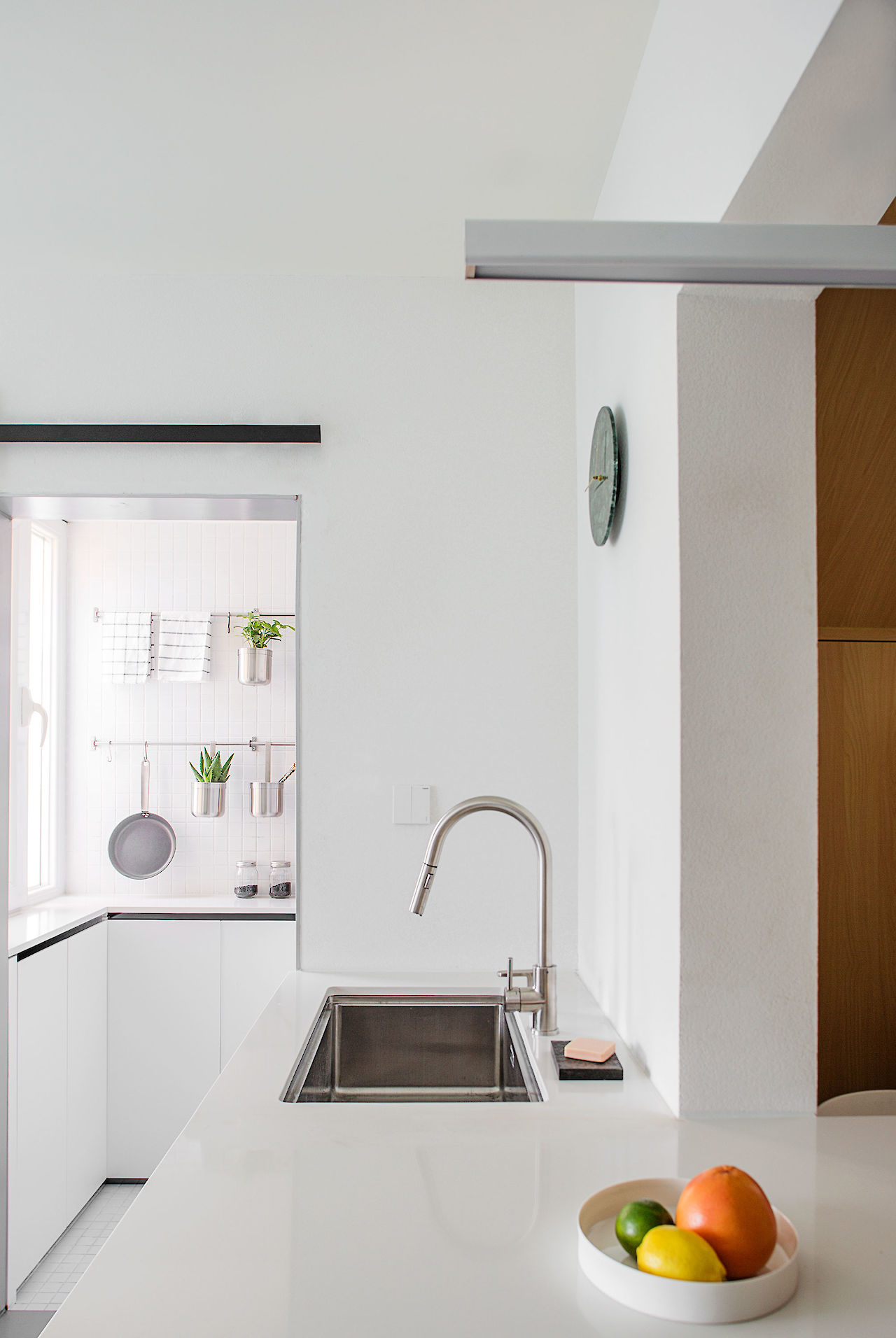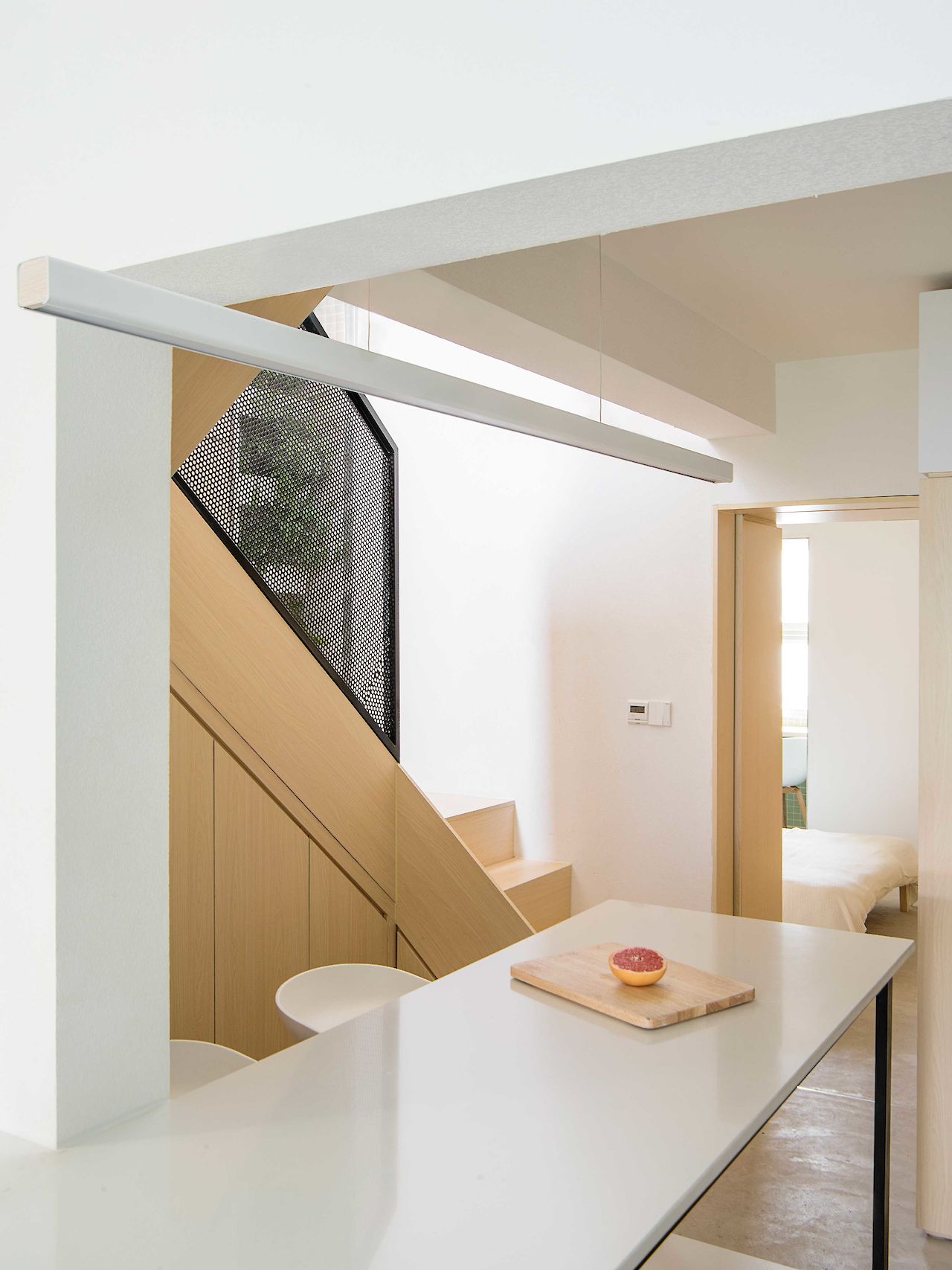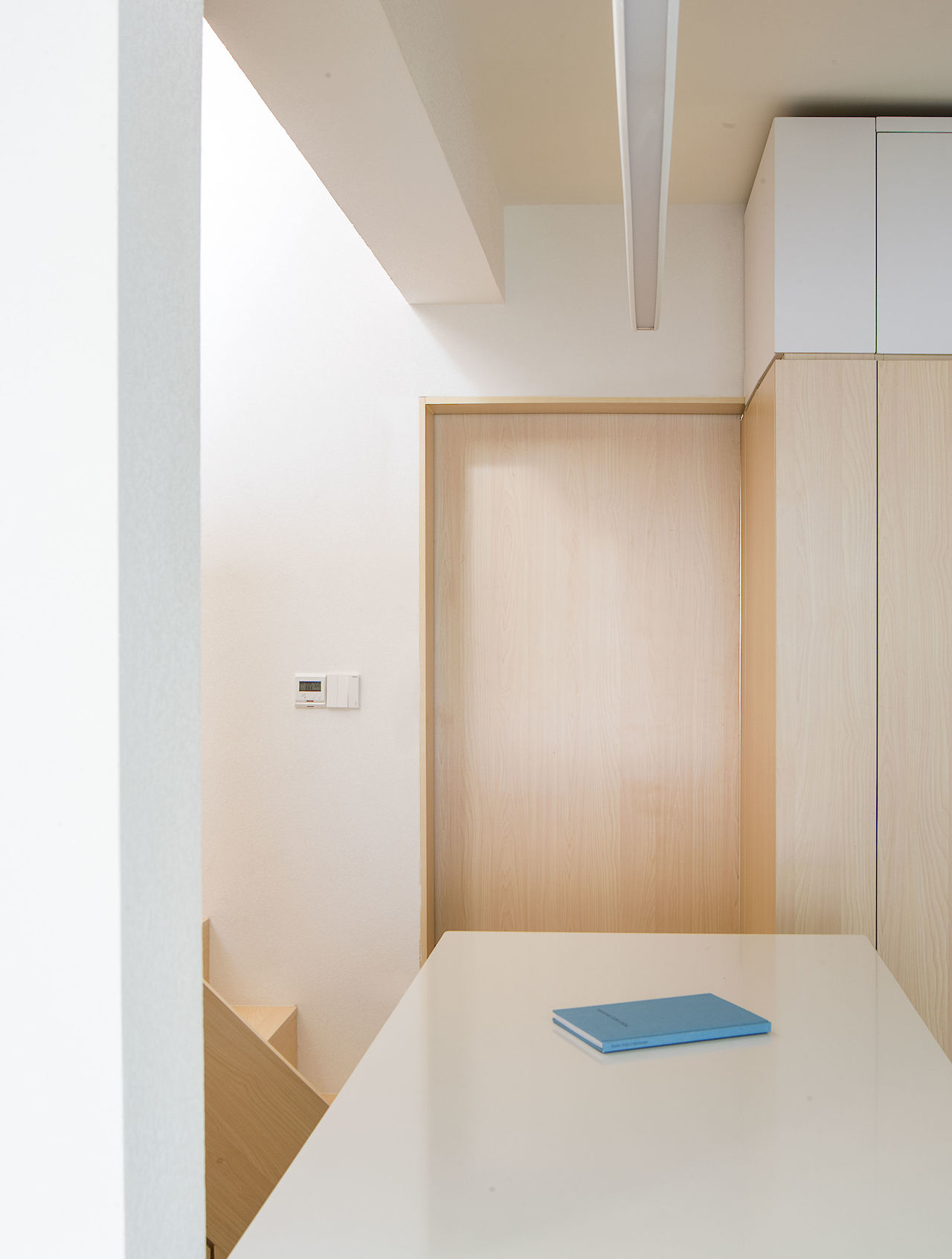 In order to make the small apartment feel spacious, smart solutions were applied to integrate storage space such as utilizing the space underneath and surrounding the staircase and under lower beam locations. Boiler, gas meter, electricity inlet, air-conditioning units, fridge and oven are integrated around the staircase. The first floor bathroom is hidden behind the cabinet wall whilst the second floor hosts a larger bathroom where washing and drying machines are located.