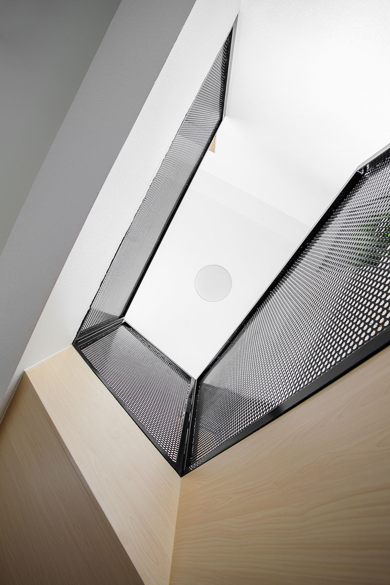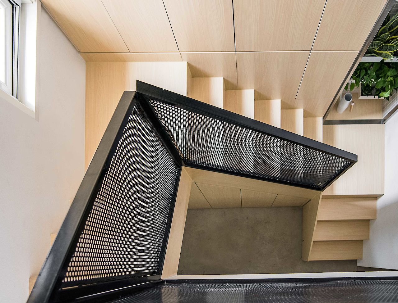 The central staircase features a collection of the planters, highlighting the green character of the space upon entering the apartment. A similar strategy is applied to the formerly dead-end and un-usable pocket spaces as they are transformed into a study room and a winter garden.